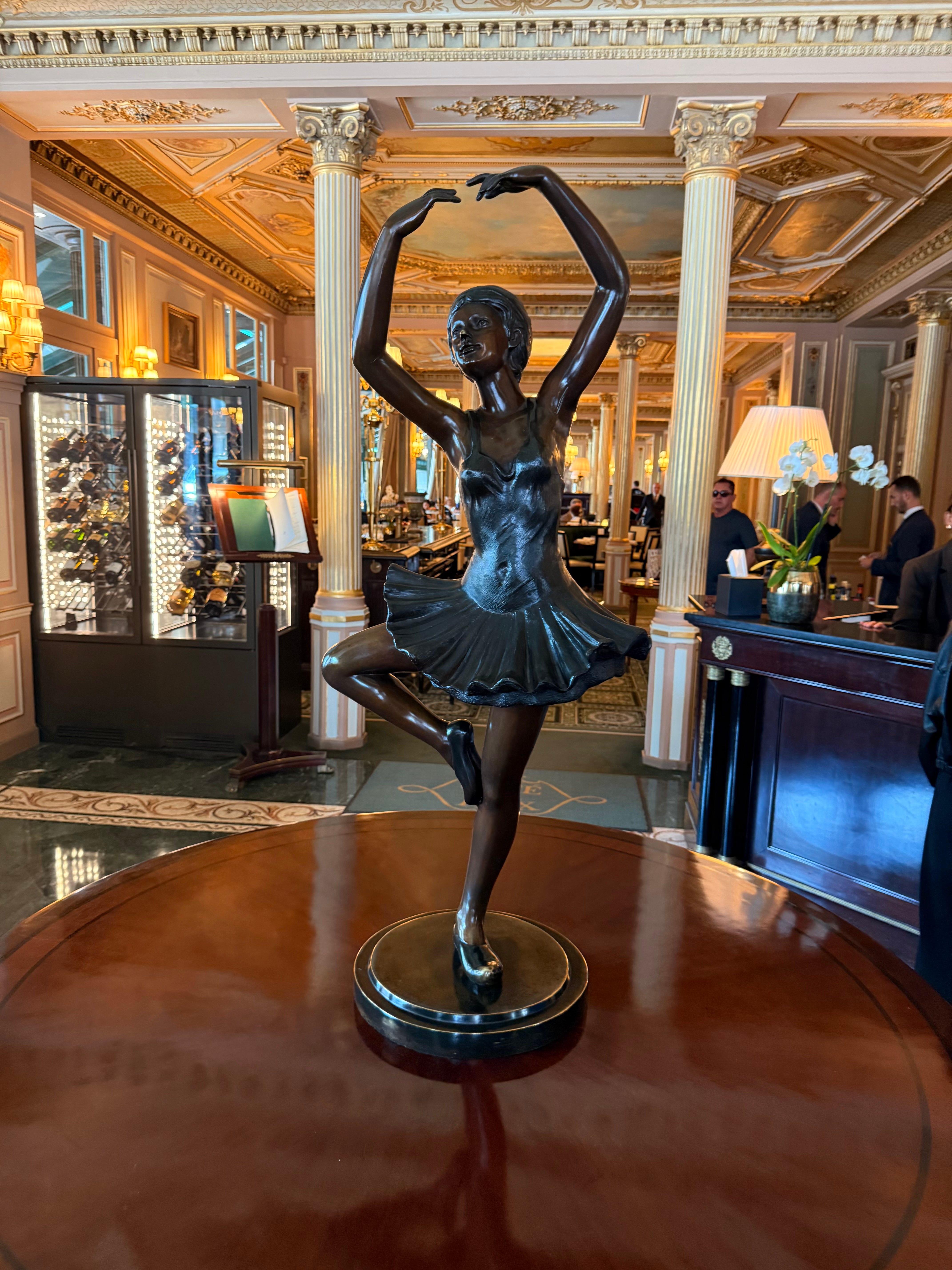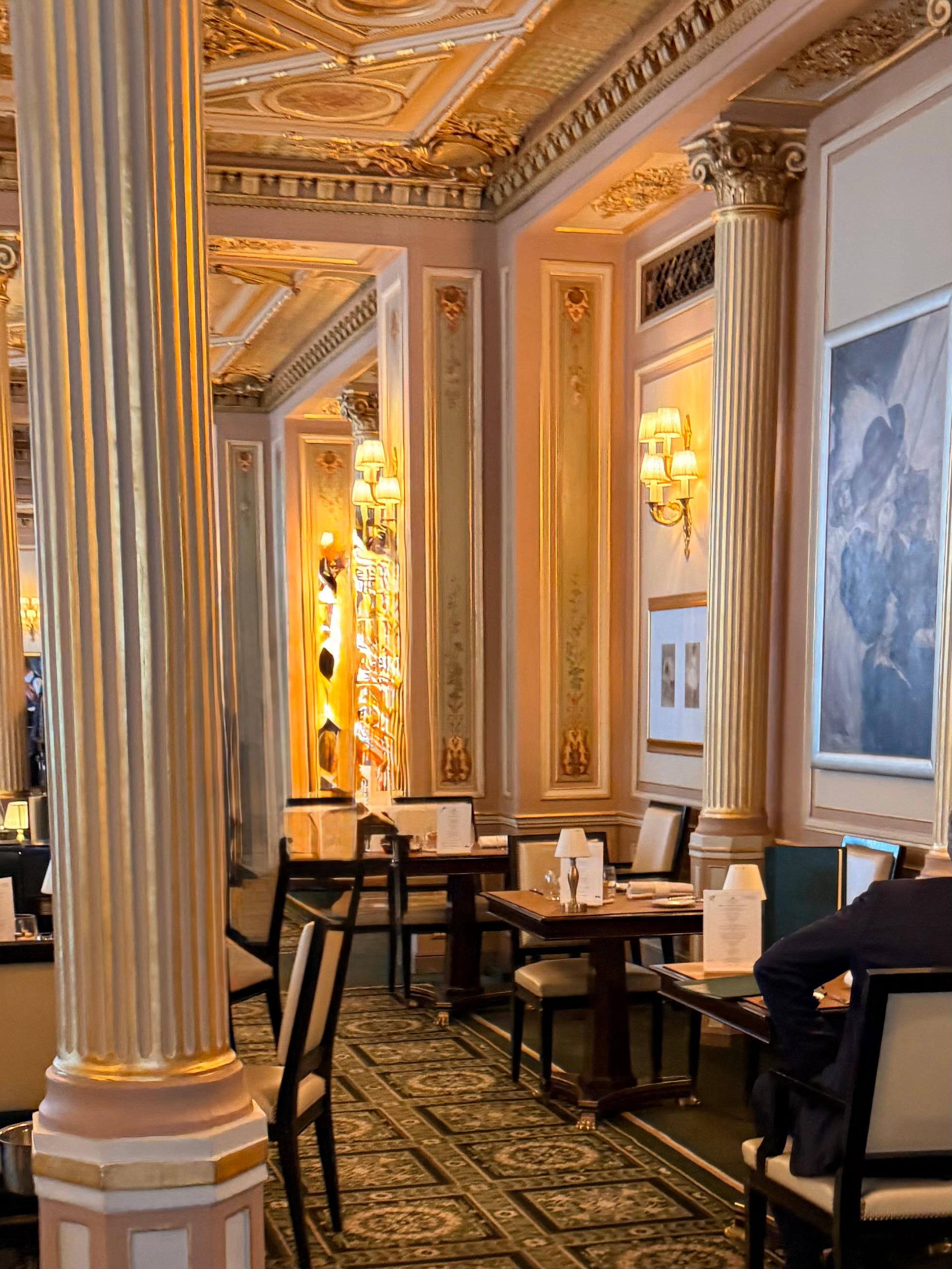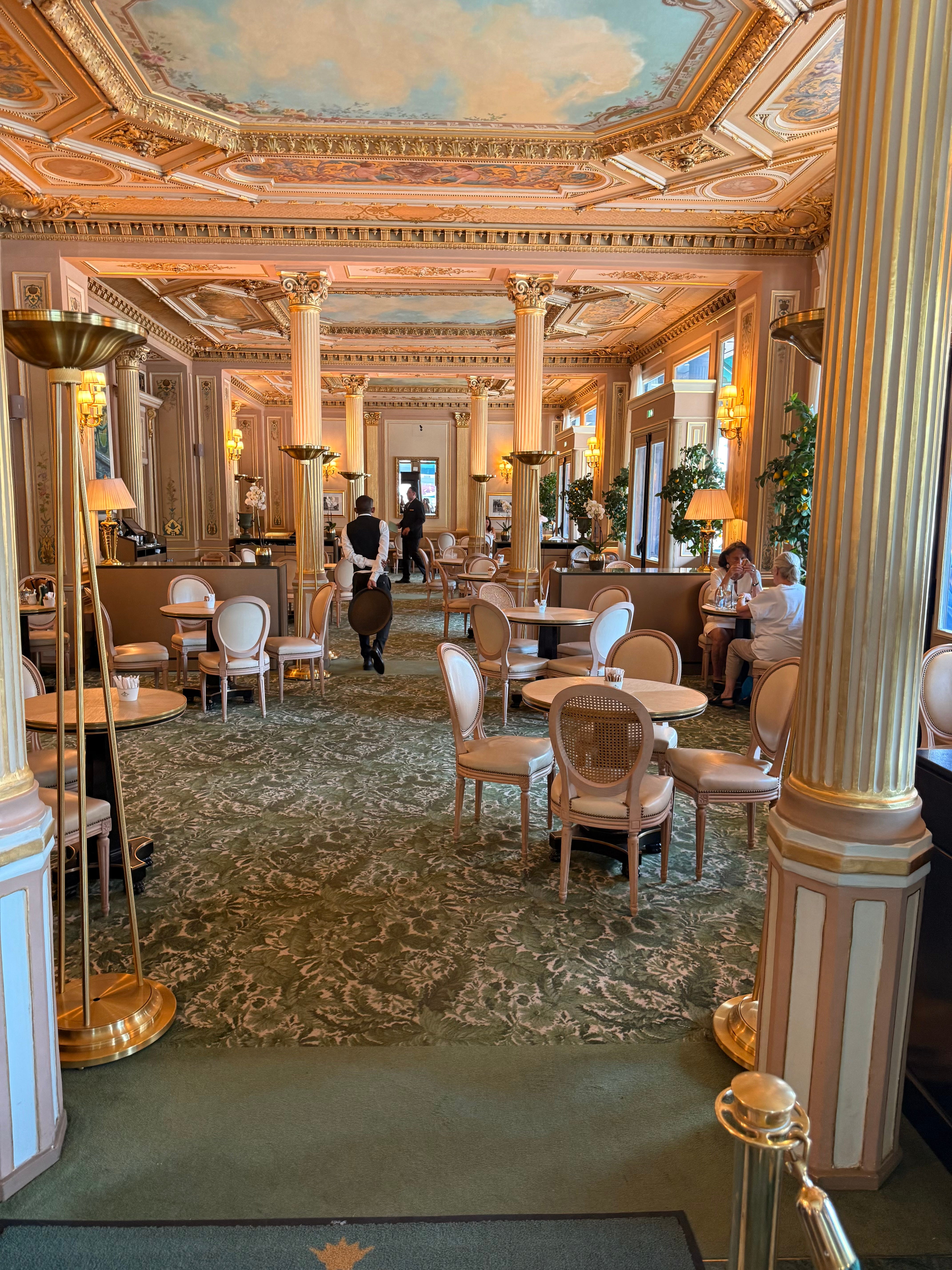 The interior of the Café de la Paix has a hushed richness. Carpets, drapery, and upholstered seating absorb the sounds and create a sense of luxurious intimacy. Gilded moldings catch the light from crystal chandeliers, and mirrors stretching along the walls give the space an impression of expansiveness and movement. Above, a blue sky with white clouds is painted on the ornamented ceilings, adding an airy elegance and an overall feeling of sophistication. But above all, what stands out is the atmosphere of a place that has absorbed decades of conversations. If only its walls could talk.